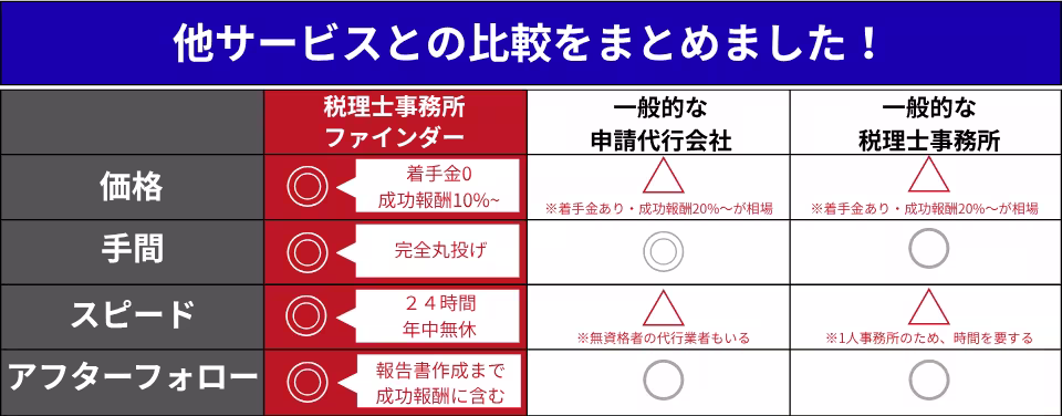 税理士事務所ファインダーでは、成功報酬10%~で補助金申請代行サービスを行っています。
